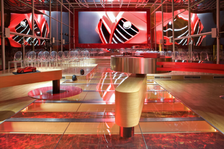 The stage represented, in a seemingly unstructured order, a kind of Leonardo-esque workshop, full of ideas, details, and instruments that together tell the story of the car’s creation.