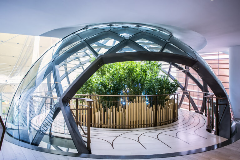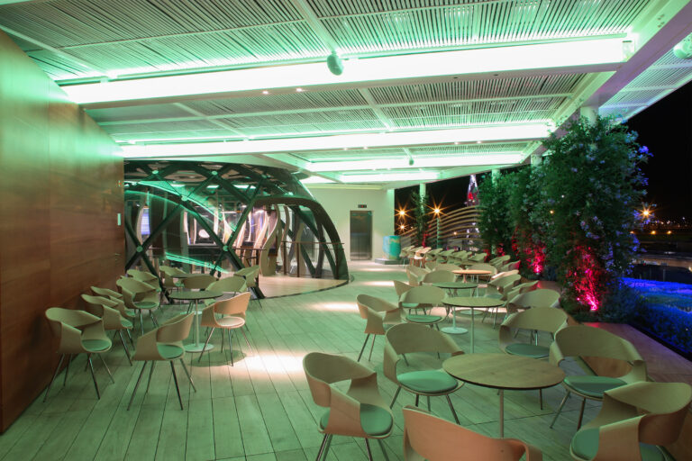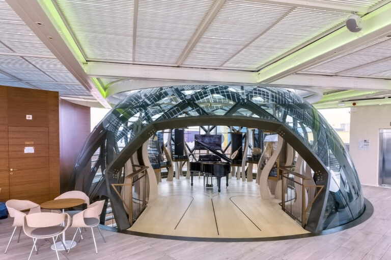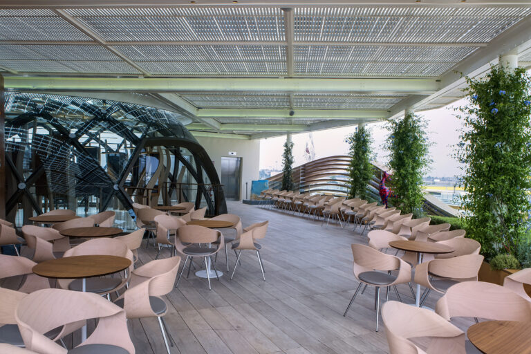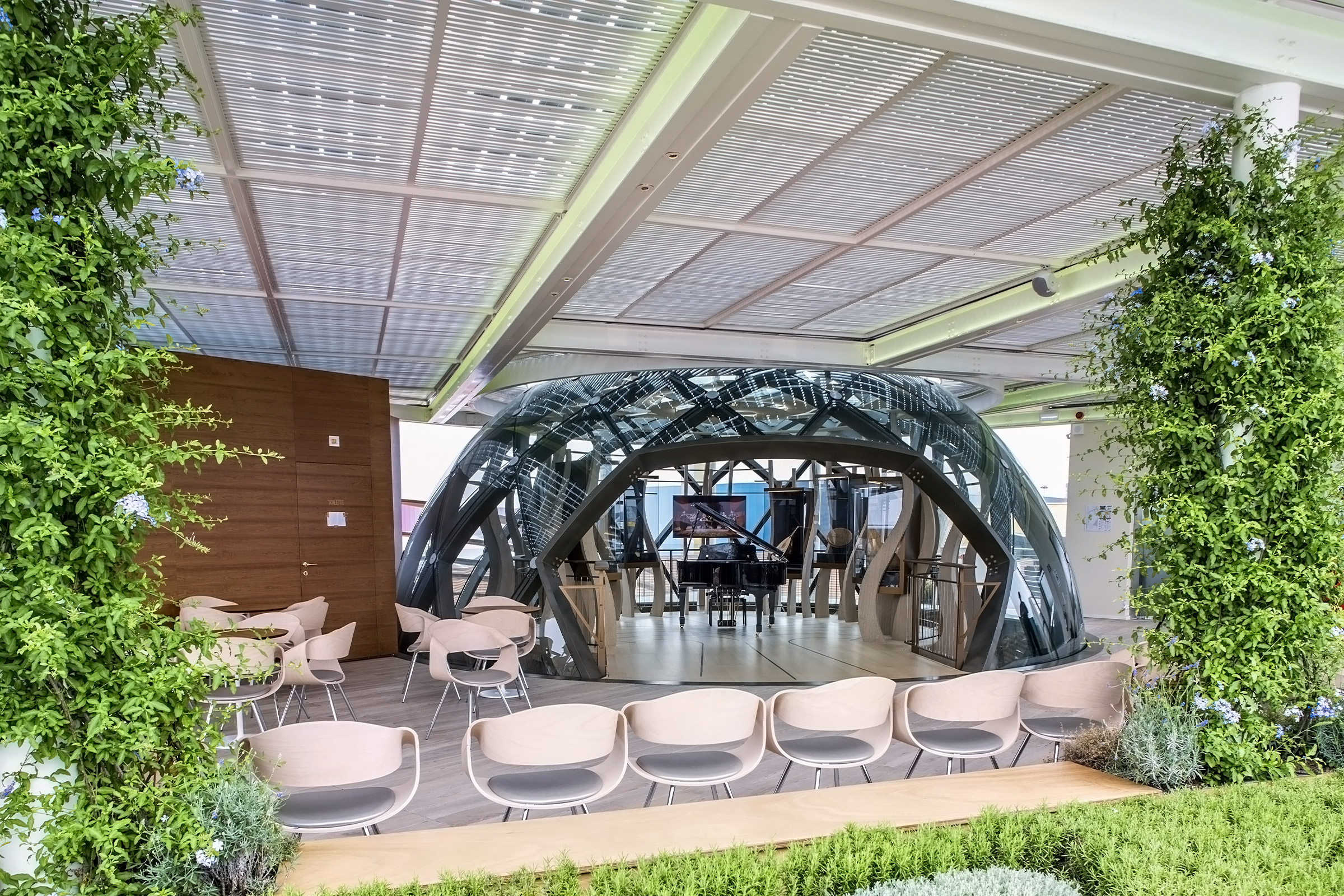 The Pavilion is made up of three biospheres encased like precious jewels in the building’s overall structure. The curved wooden walls that embrace the building safeguard the Pavilion’s microclimate, evoke the winds typical of the Azerbaijani landscape, and symbolize the cultural and creative energy that has always flown across the country.