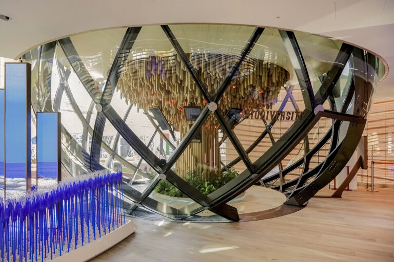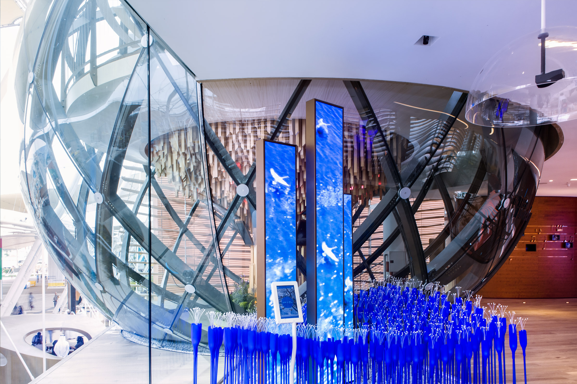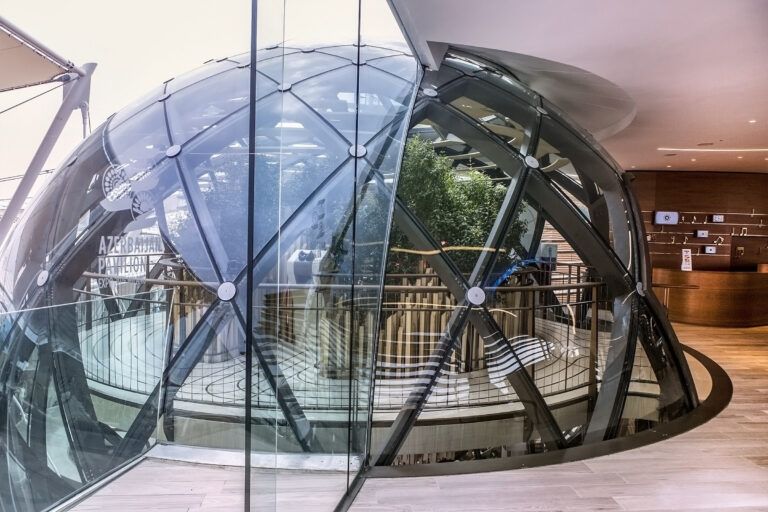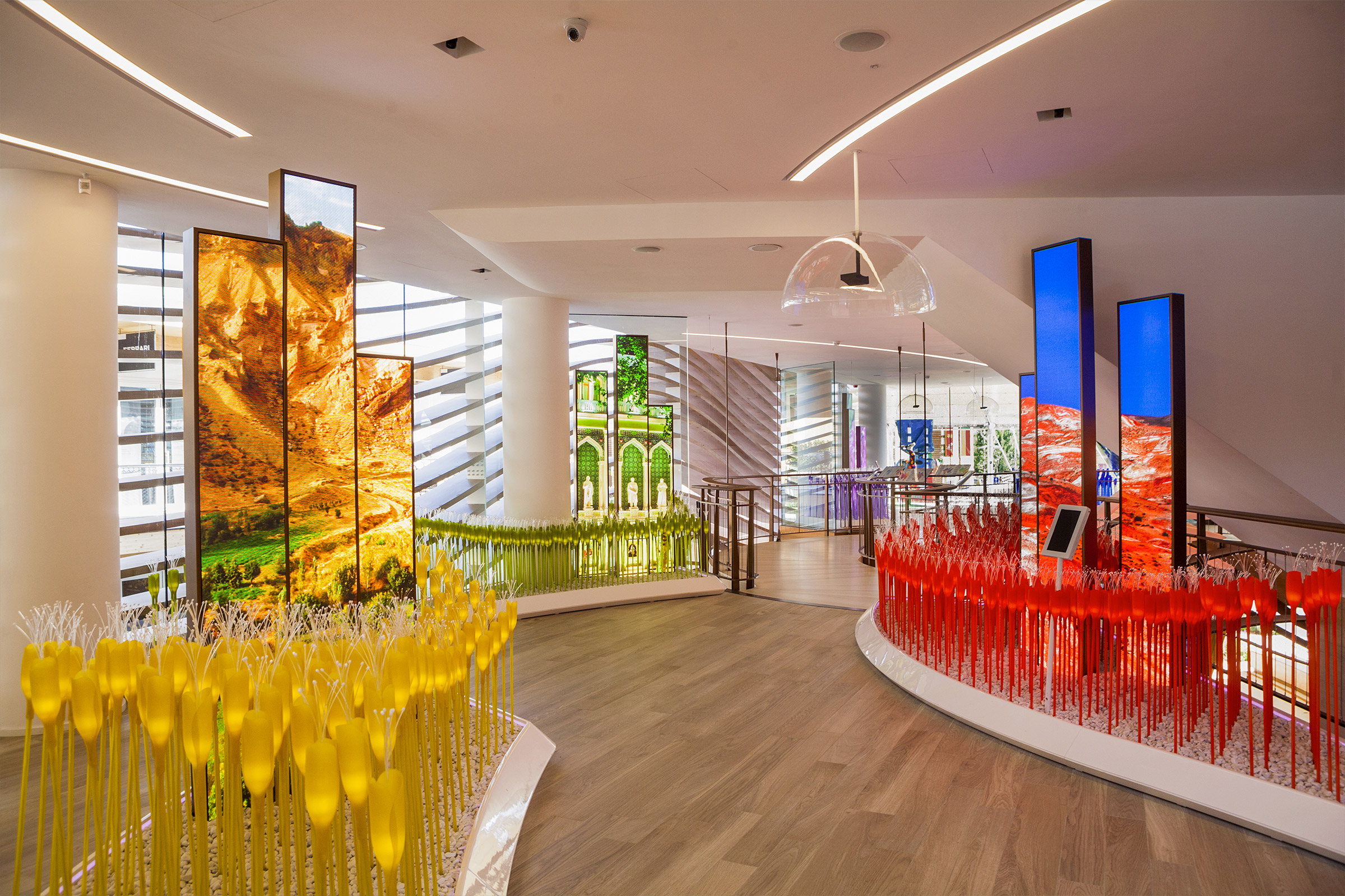 In order to tell the story of the harmony and variety of Azerbaijan’s landscape and culture, representing the country’s great wealth, the biosphere metaphor was chosen, a system that is open to external influences while capable of protecting and fostering the growth of life inside it.