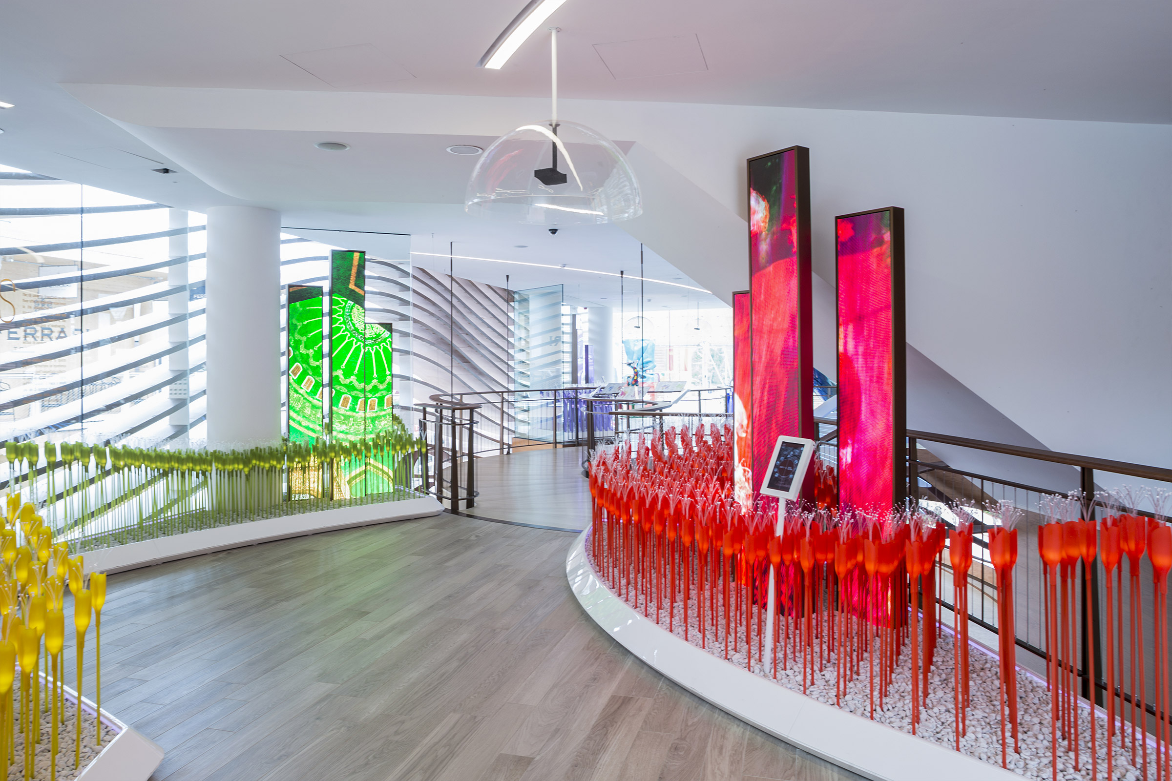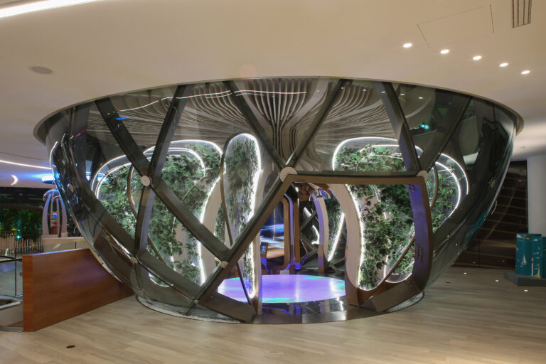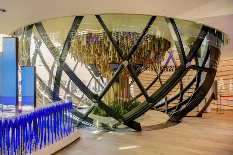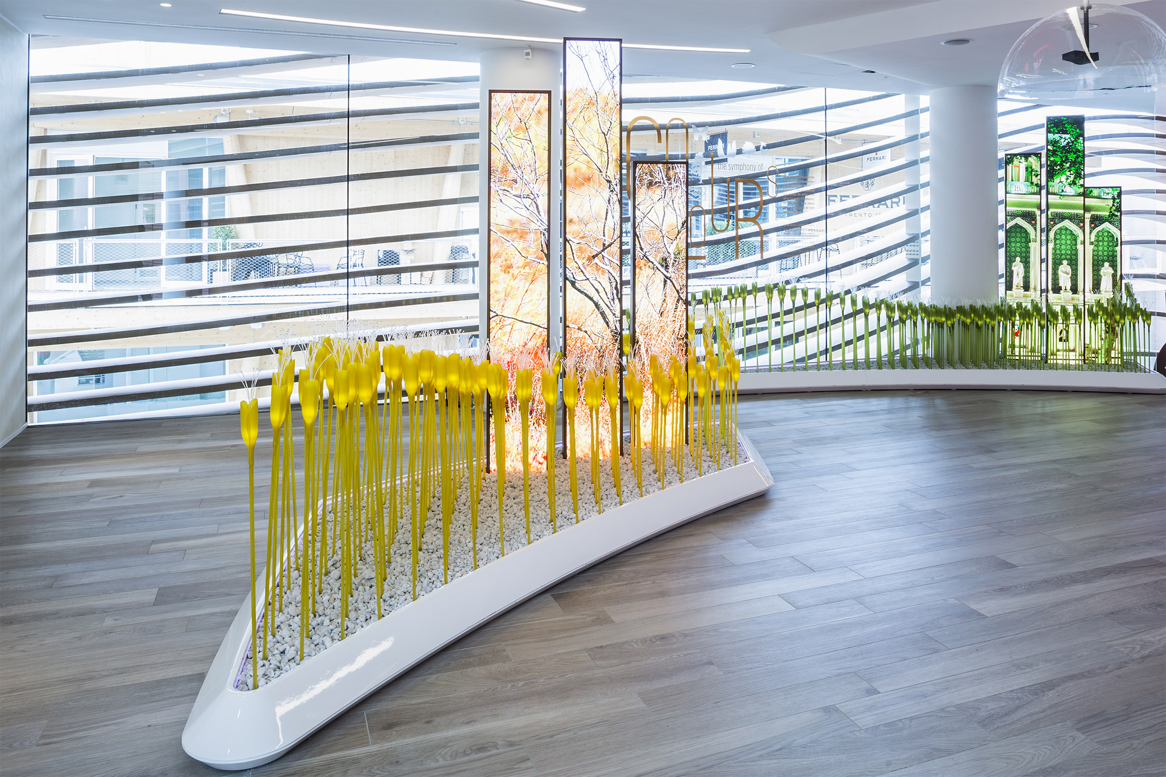In order to tell the story of the harmony and variety of Azerbaijan’s landscape and culture, representing the country’s great wealth, the biosphere metaphor was chosen, a system that is open to external influences while capable of protecting and fostering the growth of life inside it.