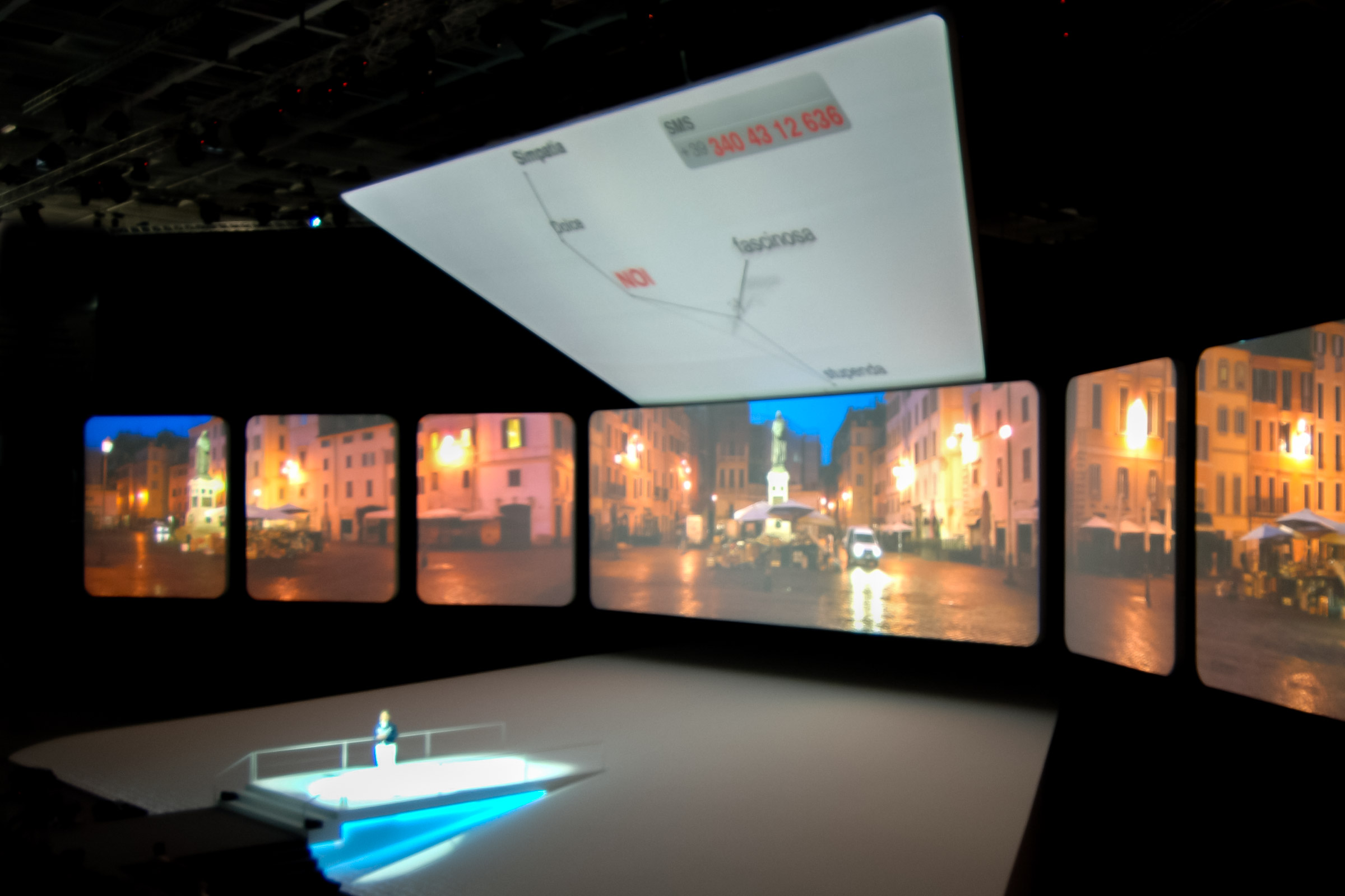 The communication structure offers the visitors the possibility to interactively participate to the convention thanks to a graphic sky coming alive in real time with the keywords related to the product that the audience is sending by SMS.
