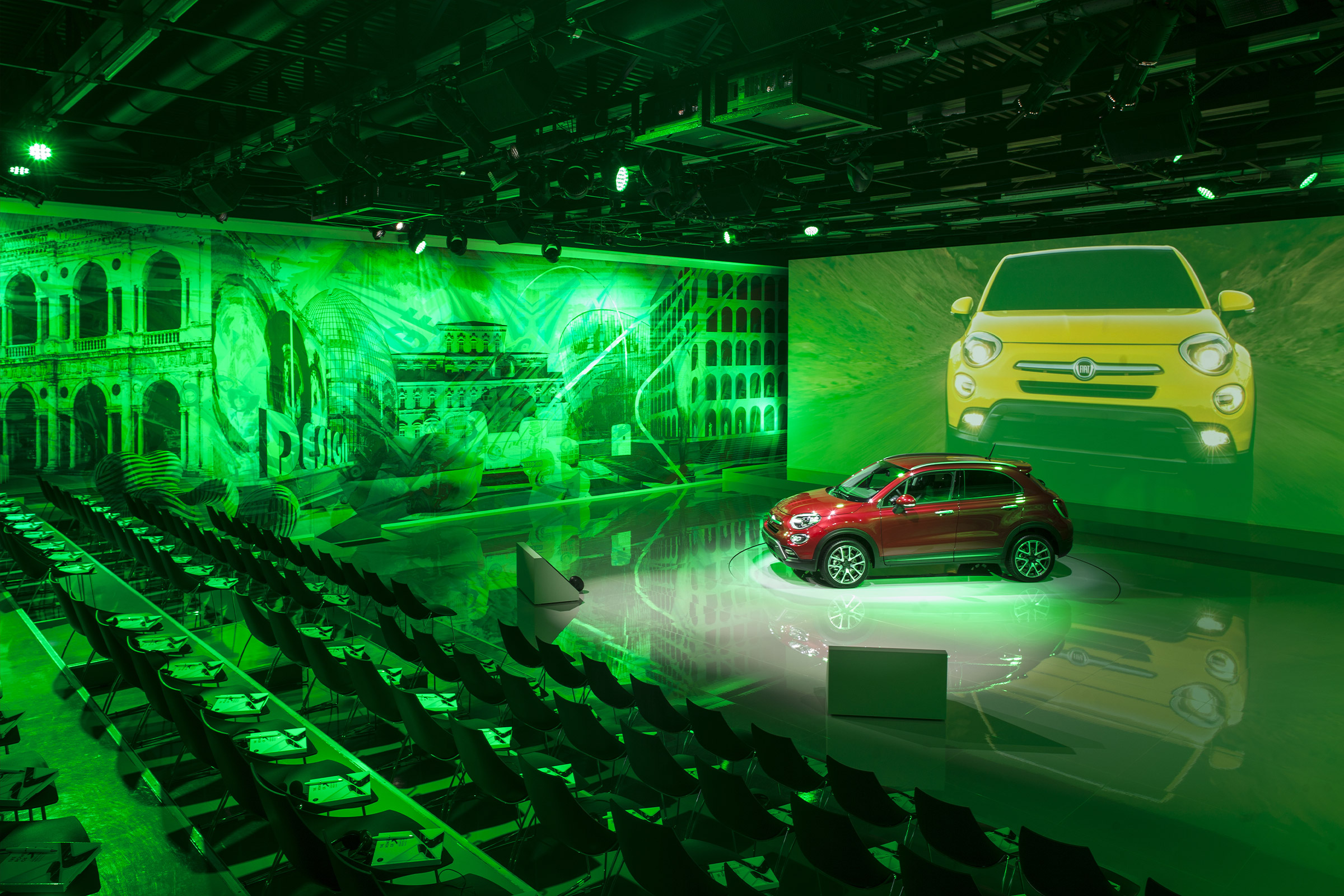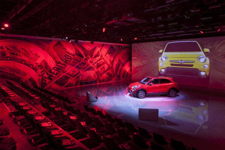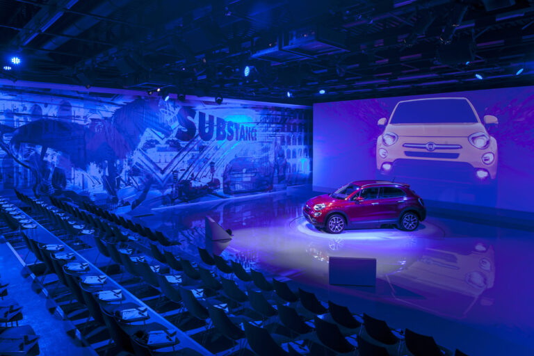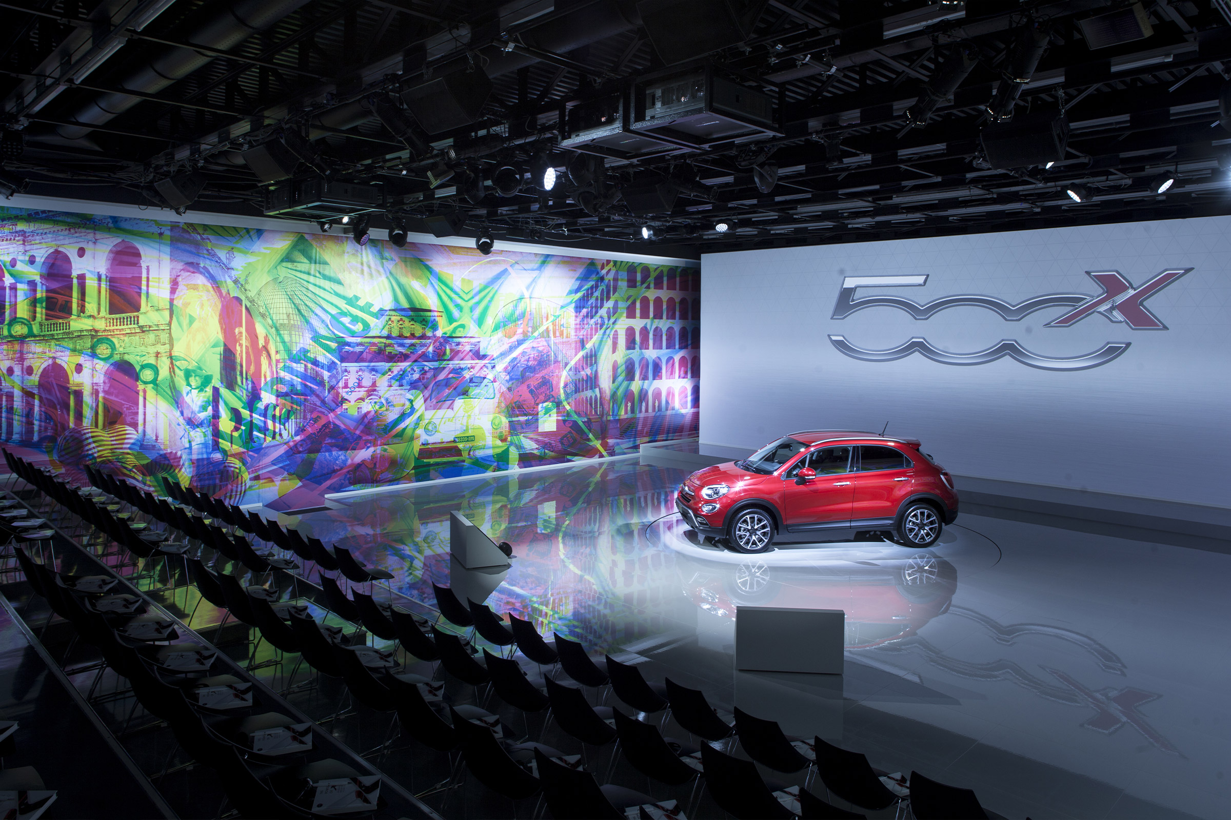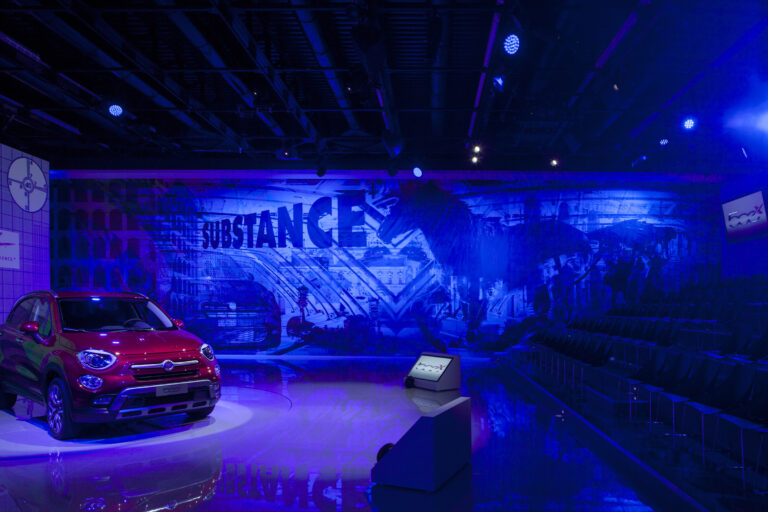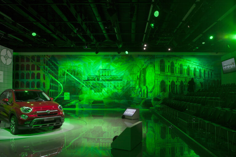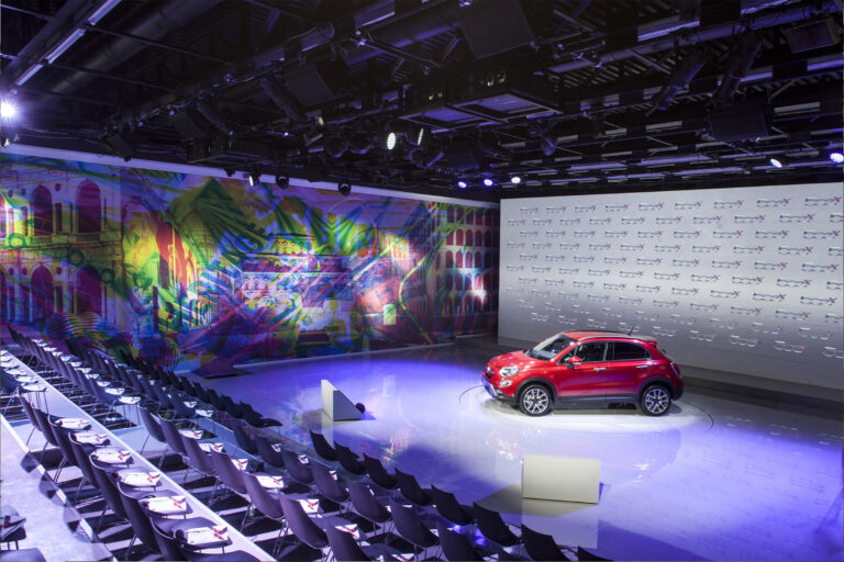For the launch of the new 500X, Simmetrico was in charge of the presentation to the press, to fleet managers and dealers, both national and international, designing a set space featuring a large central projection screen flanked by a mural, measuring 22 by 5 meters, realized in an original technique by a duo of Milanese artists and designers Carnovsky.