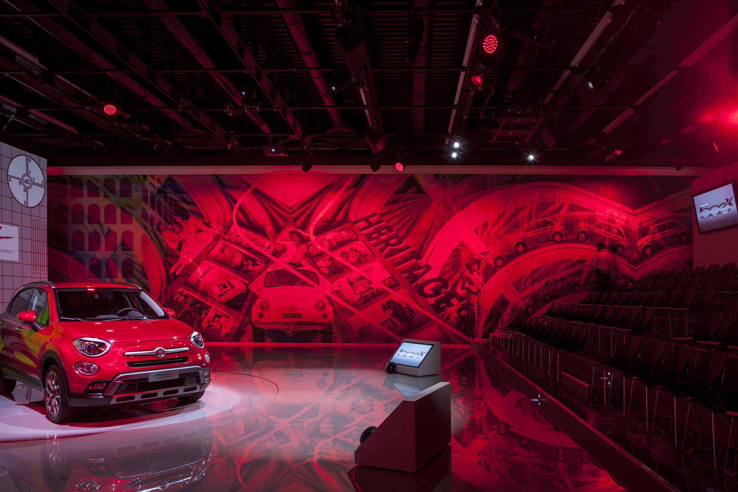The double mural, illuminated by RGB (Red-Green-Blue) lights, reveals three layers of narration that express the essence of the 500X: tradition, design and the substance, with X as the common denominator. The red light represents tradition and the iconic 500 DNA; green light represents the inimitable Made in Italy style, and the blue light highlights the substance and the unique character of the car.