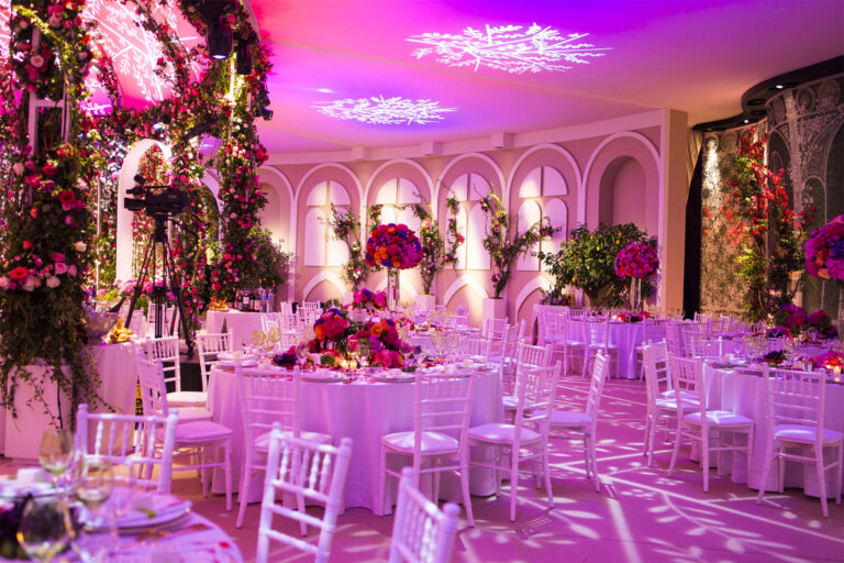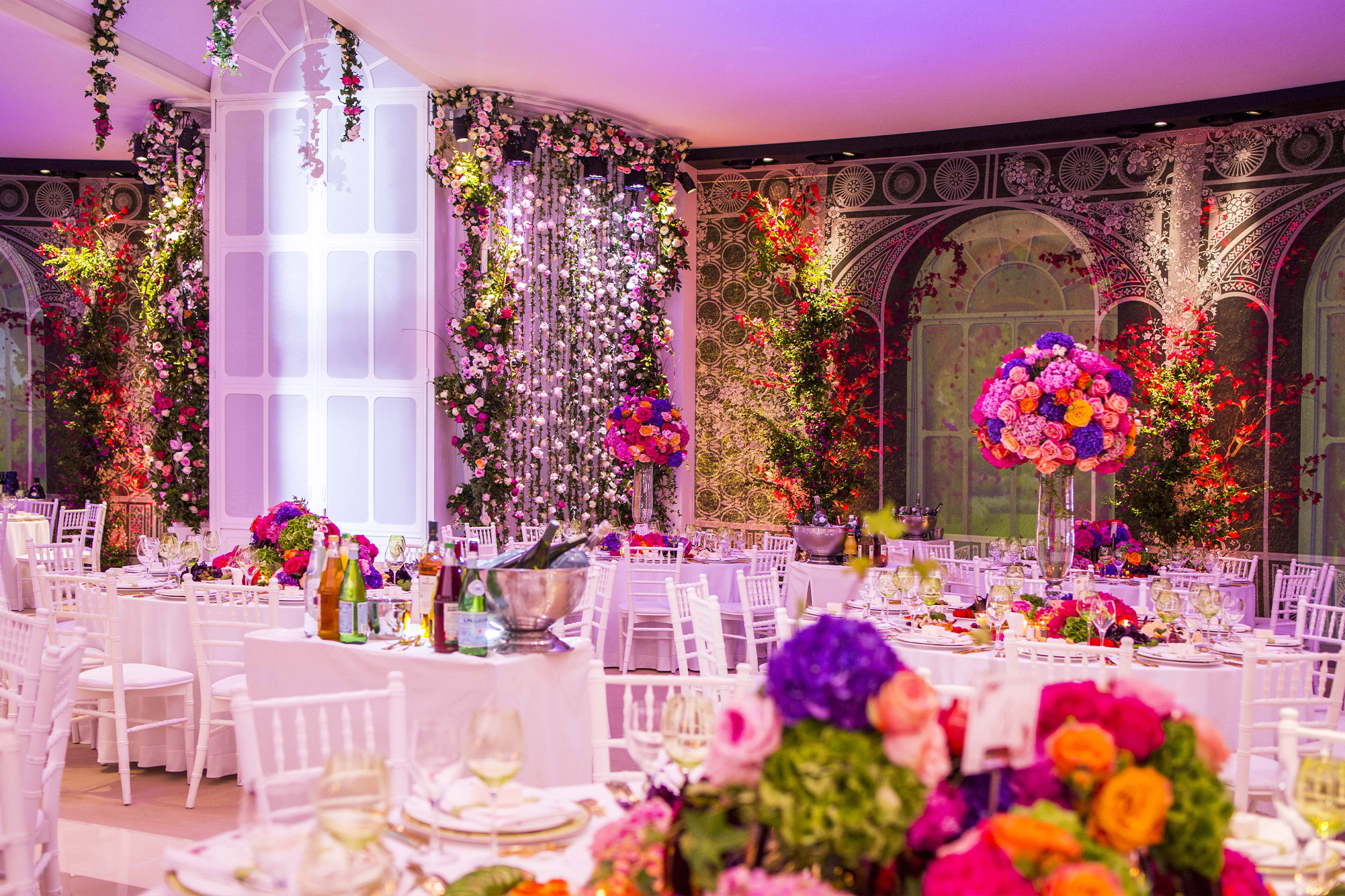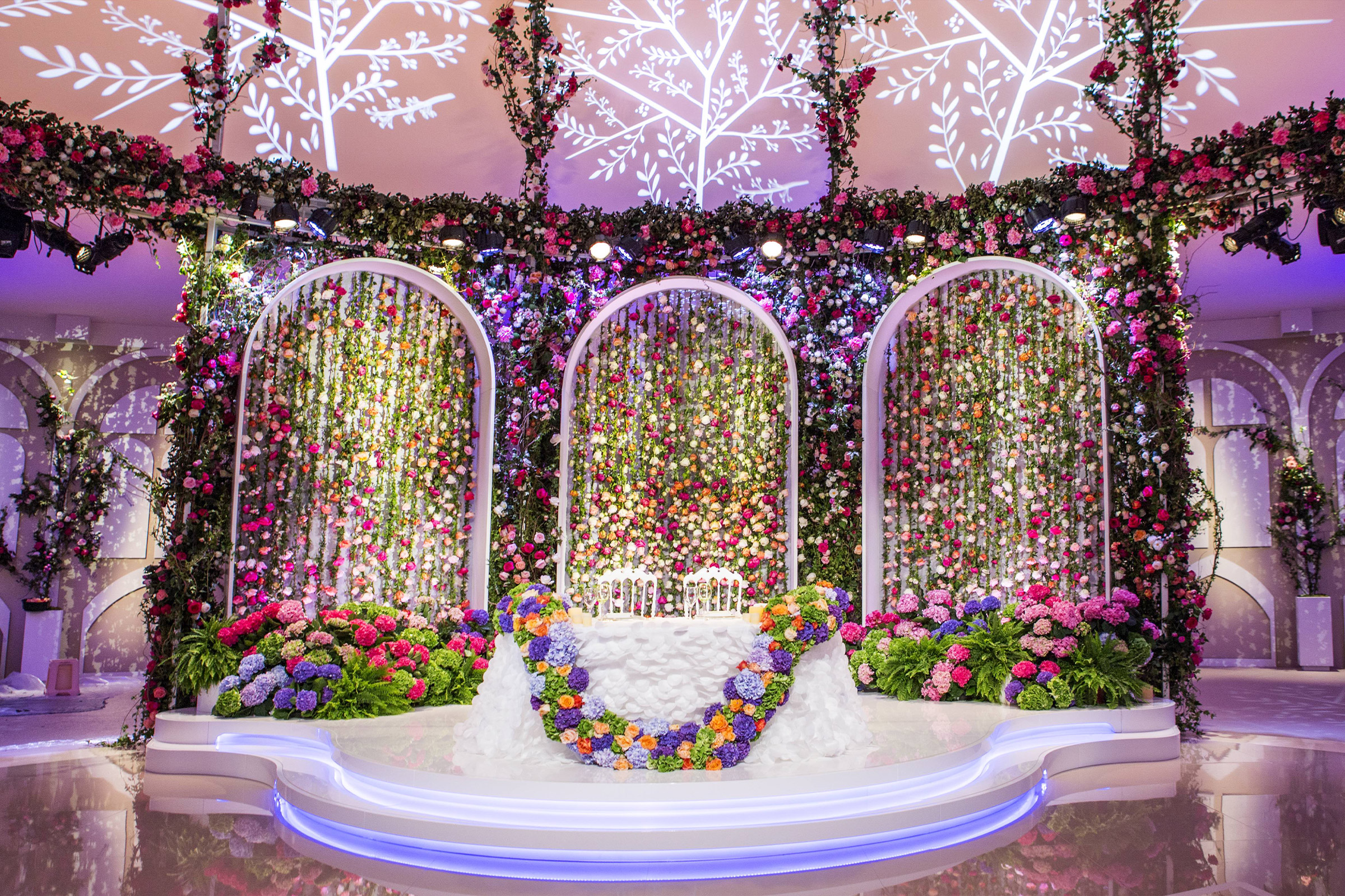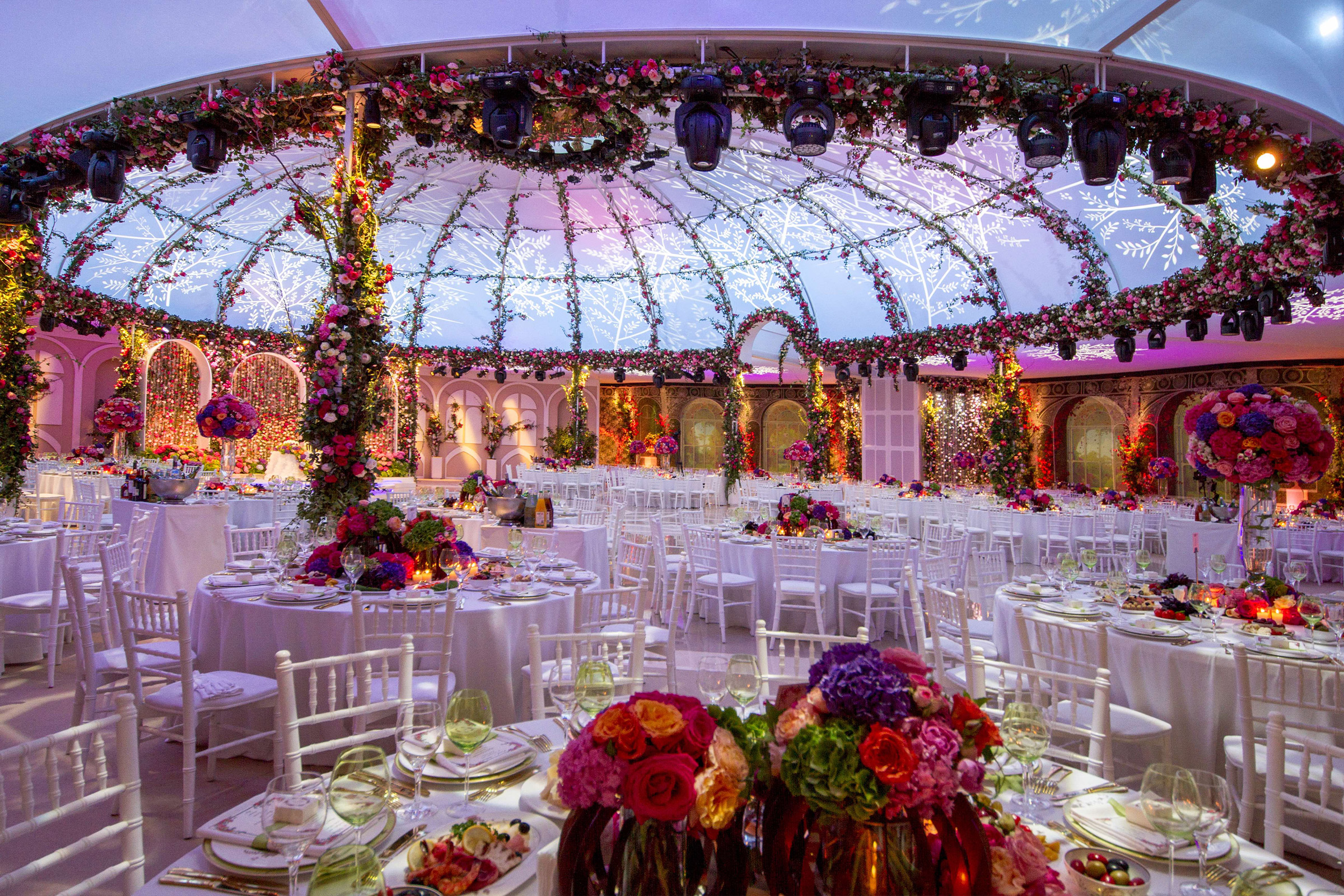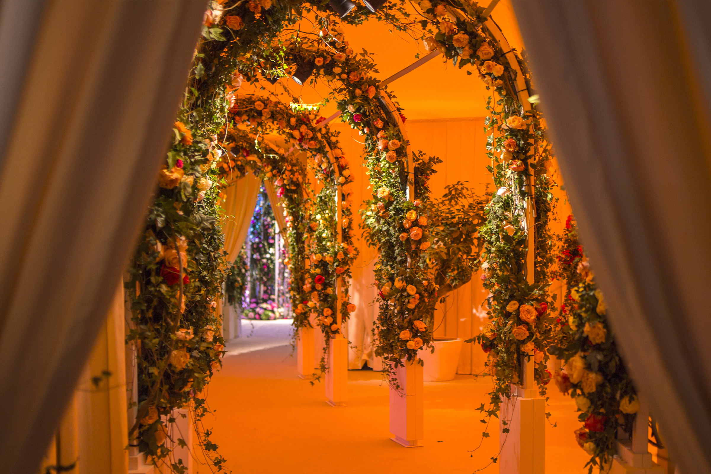 The foyer became a sort of flowered tunnel made of ivy-clad and roses archways. Specific light effects recreated an immersive walk-in environment.