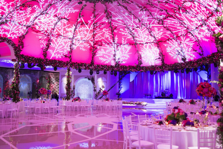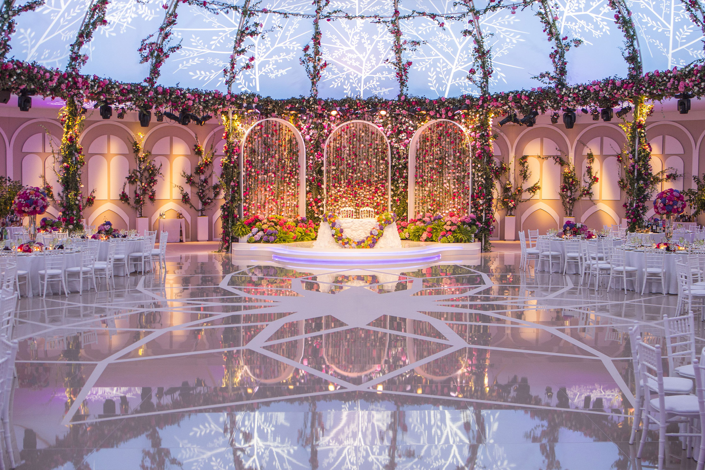 The central hall revealed to the guests with a 450sqm light projected convex surface, developed on central elliptical dome 26x17mt wide and 8.60mt high. The dome was enlighted by several custom scenes made by gobo projections, recreating dreamy scenarios like constellations, flowers, graphic patterns, leaves, decors and the spouses logo.