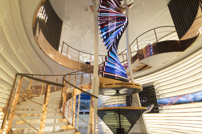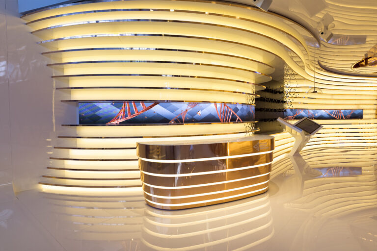 The inside space is organised around a large kinetic installation that develops upwards. It is the heart of the pavilion. A large helix staircase develops around it, leading to the first floor – it is almost a monument in honour of humanity’s intelligence. All around, the space is designed like waves in movement becoming both organic and pulsating.