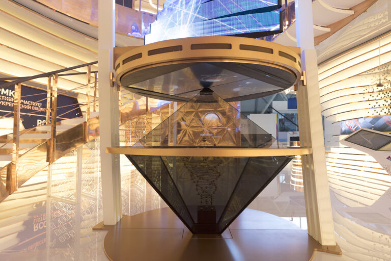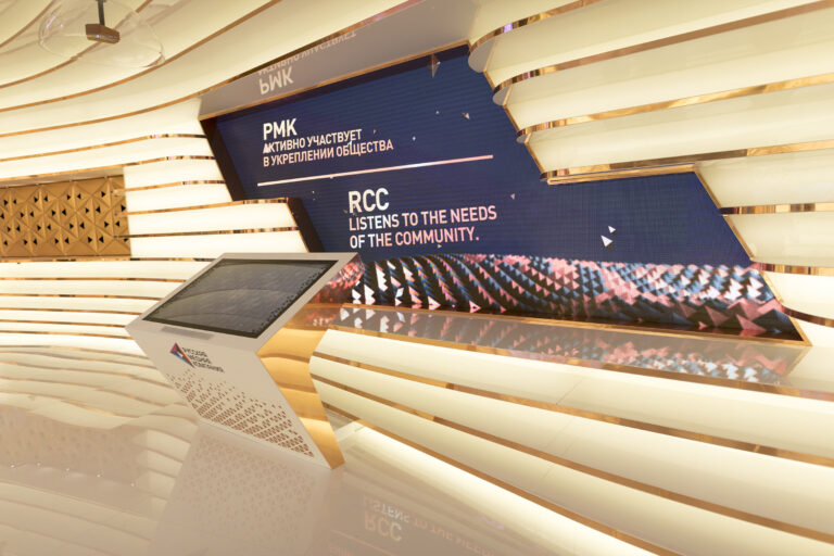 The holographic theatre moves at people passages explaining the six challenges the company is rising to. The claim is that “Life sets challenges. Russian Copper Company responds.”