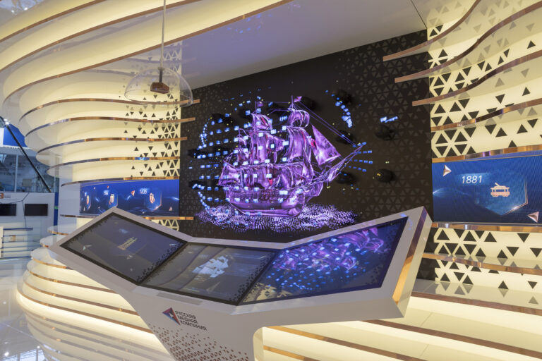 In the holographic prism at the base of the column is a representation of the Group’s five guiding values, which can be selected with a swipe. The 3D hologram animations interconnect with the visual effects of the large helix overhead. A drop of copper falling from above acts as catalyst that triggers the story-telling.