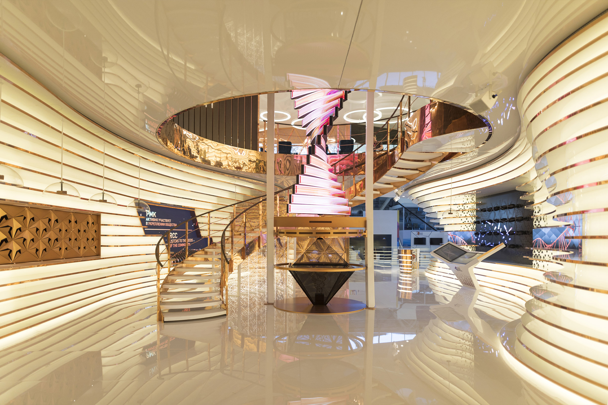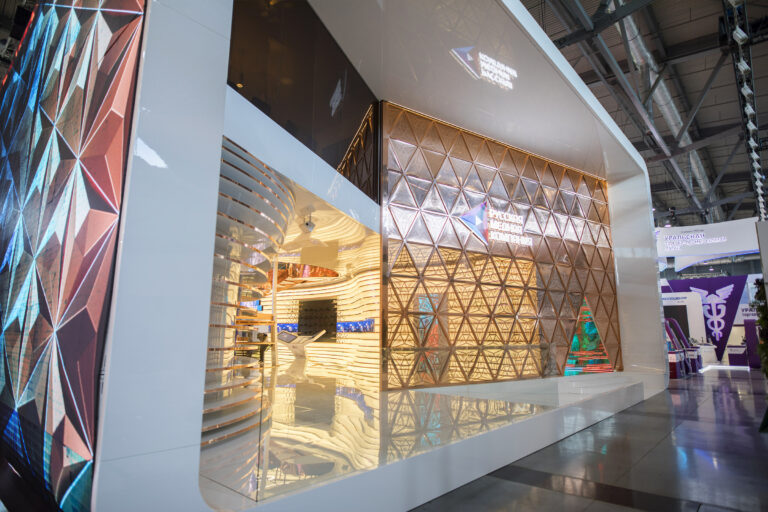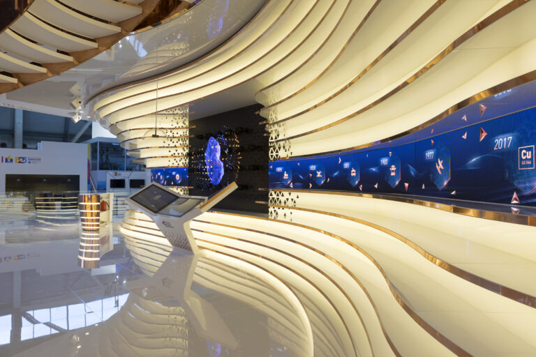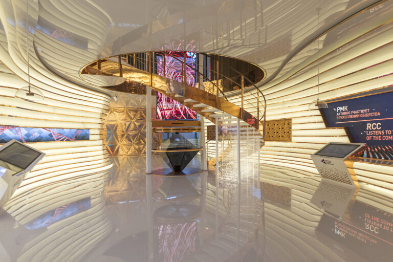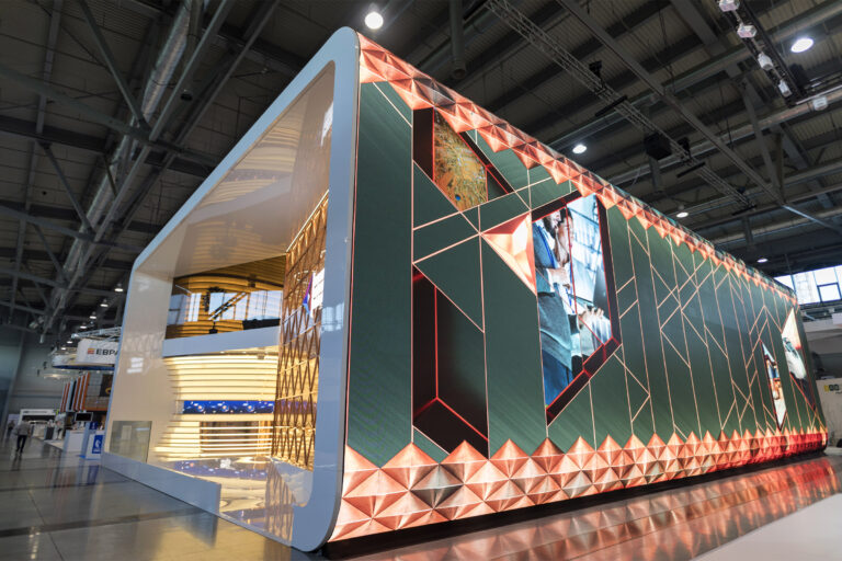 This was the idea underlying Simmetrico’s design for the Russian Copper Company pavilion at Innoprom 2018. The Russian Copper Company is one of the most important mining and processing companies in the Urals. The customer is the Main partner of the trade show, and every year they aim to amaze their interlocutors.