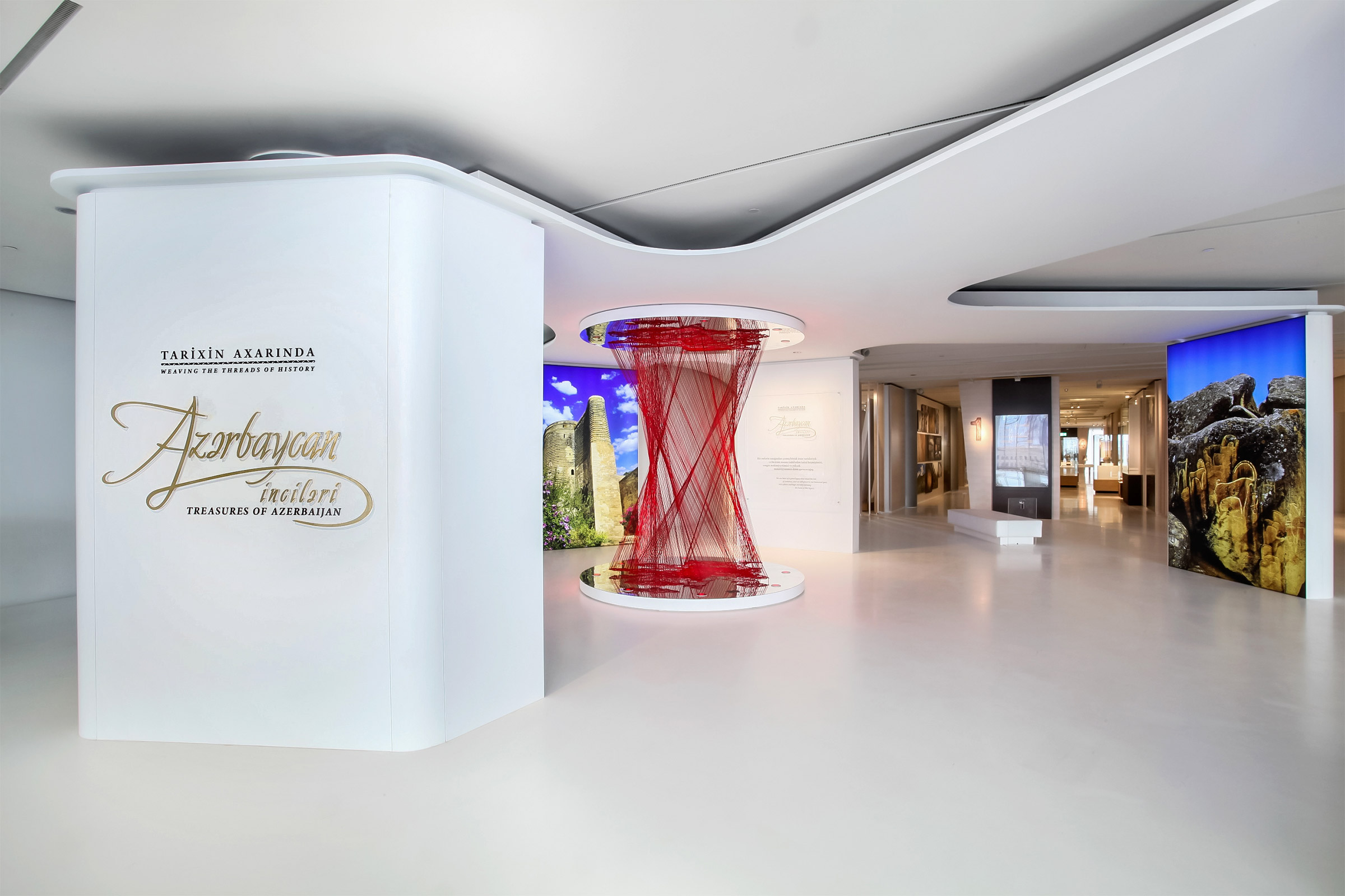 The exhibition is introduced by an installation made of woven threads, ideally representing the art of weaving and the cultural weave of Azerbaijan.